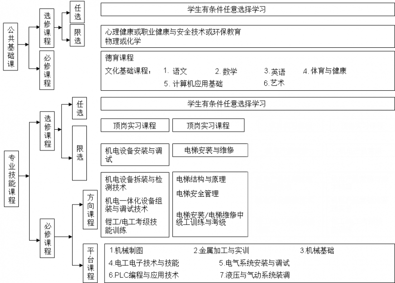 ②专业技能类:电子技能训练、家电维修、电梯安装调试、传感器应用技术、单片机应用技术、机械手与机器人技术、电气CAD技术、数控加工技术等;或技能拓展考级的强化课程,如制图员训练与考级;或社会实践课程。